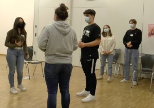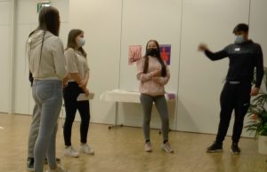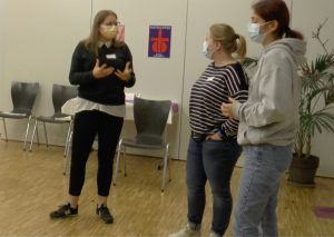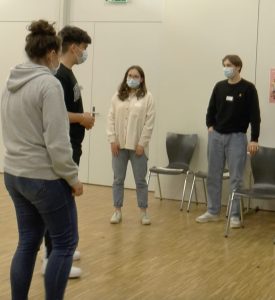 In einem Rollenspiel erhielt jeder die Rolle einer Figur aus der Zeit von Franz und Chiara. Es ging darum, dass Franz und Chiara auf dem Marktplatz von Assisi angepöbelt wurden von Bewohnern von Assisi, weil sie sich um die Aussätzigen kümmern und bei den Armen leben und so eine Gefahr für die Stadt darstellen, weil sie den Aussatz oder auch andere Krankheiten in die Stadt tragen. Die Schwestern von Chiara, aber auch Freunde von Franz verteidigten die beiden, während wiederum die Eltern der beiden sie überhaupt nicht verstehen konnten und nur wollten, dass sie wieder „normal“ würden und nach Hause kämen. Sie könnten ja mit ihrem Geld den Armen viel besser helfen als jetzt. Doch Franziskus und Chiara hielten dagegen, dass die Armen und auch die Aussätzigen nicht primär Geld, sondern menschliche Nähe und Wärme brauchten.